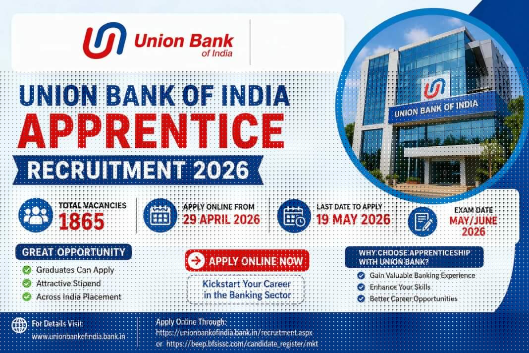 യൂണിയന് ബാങ്ക് ഓഫ് ഇന്ത്യയില് ജോലി നേടാന് അവസരം. രാജ്യത്തെ വിവിധ ശാഖകളിലായി അപ്രന്റീസ് റിക്രൂട്ട്മെന്റാണ് നടക്കുന്നത്. ആകെ 1865 ഒഴിവുകളാണ് വന്നിട്ടുള്ളത്. യോഗ്യരായ ഉദ്യോഗാര്ഥികള്ക്ക് മെയ് 19 വരെ അപേക്ഷിക്കാം.