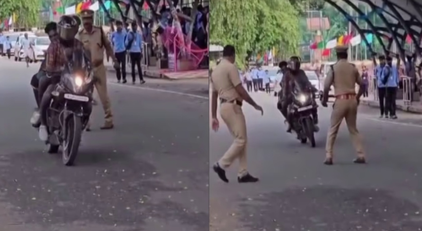 പാല സെൻതോമസ് കോളജിനു മുന്നിലായിരുന്നു സംഭവം. രാഷ്ട്രപതിയുടെ സന്ദർശനത്തോടനുബന്ധിച്ച് ഗതാഗത നിയന്ത്രണം ഏർപ്പെടുത്തിയ റോഡിലേക്ക് ബൈക്കിലെത്തുകയും തടയാൻ ശ്രമിച്ച പോലീസ് ഉദ്യോഗസ്ഥനെ വെട്ടിച്ച് കടന്നുകളയുകയുമായിരുന്നു. ഇതിന്റെ വിഡിയോ ദൃശ്യങ്ങൾ പുറത്തുവന്നിരുന്നു. പോലീസ് കൈകാണിച്ച് നിർത്താൻ ആവശ്യപ്പെട്ടിട്ടും ഇവർ നിർത്താതെ പോയി. ബൈക്കിന് പിൻ സീറ്റിൽ ഇരുന്ന മറ്റ് രണ്ടുപേർ ഹെൽമറ്റും ധരിച്ചിരുന്നില്ല. നിർത്താതെ പോയ ബൈക്ക് പിന്നീട് പോലീസ് കസ്റ്റഡിൽ എടുക്കുകയും ചെയ്തിരുന്നു. ബൈക്കിന് ഇന്ഷുറന്സ് ഇല്ലായിരുന്നു. ബൈക്ക് മോട്ടോര് വാഹന വകുപ്പ് കസ്റ്റഡിയില് എടുത്തിട്ടുണ്ട്.