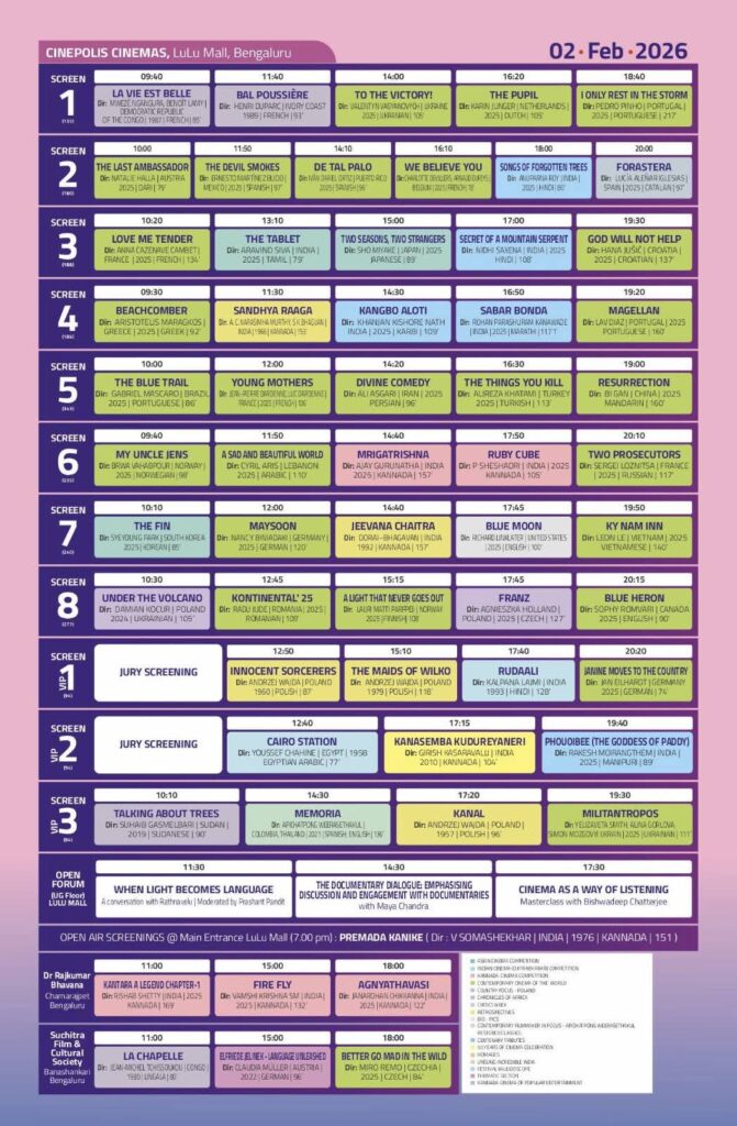 ചലച്ചിത്രോത്സവത്തിന്റെ നാലാം ദിവസമായ ഇന്ന് സമകാലിക സമകാലിക ലോക ചിത്രങ്ങൾ, ഏഷ്യൻ സിനിമ മത്സര വിഭാഗം, ഇന്ത്യൻ സിനിമ മത്സര വിഭാഗം, കന്നട സിനിമ മത്സര വിഭാഗം എന്നിങ്ങനെ 59 ചിത്രങ്ങളാണ് വിവിധ സ്ക്രീനുകളിലായി പ്രദർശിപ്പിക്കുന്നത്.