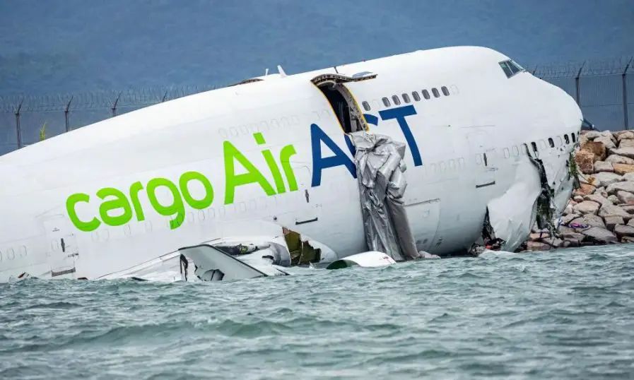 ദുബൈയില് നിന്ന് വന്ന ചരക്ക് വിമാനം ഹോങ്കോങ് അന്താരാഷ്ട്ര വിമാനത്താവളത്തില് ഇറങ്ങുന്നതിനിടെയാണ് റണ്വേയില്നിന്ന് തെന്നിമാറി കടലില് പതിച്ചത്. ബോയിങ് 747 ചരക്ക് വിമാനം വിമാനത്താവളത്തിന്റെ ഭിത്തിക്കരികെ കടലില് ഭാഗികമായി വെള്ളത്തില് മുങ്ങിക്കിടക്കുന്ന ചിത്രം പുറത്തുവന്നു. വിമാനത്തിന്റെ നോസ്, ടെയില് എന്നിവ വേര്പെട്ട നിലയിലാണ്.