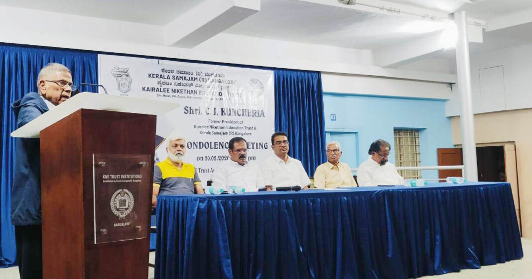 ബെംഗളൂരു: ബാംഗ്ലൂർ കേരളസമാജത്തിന്റെയും കെഎൻഇ ട്രസ്റ്റിന്റെയും മുൻ പ്രസിഡന്റ് ആയിരുന്ന സി ജെ കുഞ്ചെറിയയുടെ നിര്യാണത്തില്‍ അനുസ്മരണ പരിപാടി സംഘടിപ്പിച്ചു. കൈരളി നികേതൻ ഓഡിറ്റോറിയത്തിൽ വച്ചു നടന്ന ചടങ്ങിൽ കേരളസമാജം പ്രസിഡന്റ് ഹനീഫ് എം അധ്യക്ഷത വഹിച്ചു.