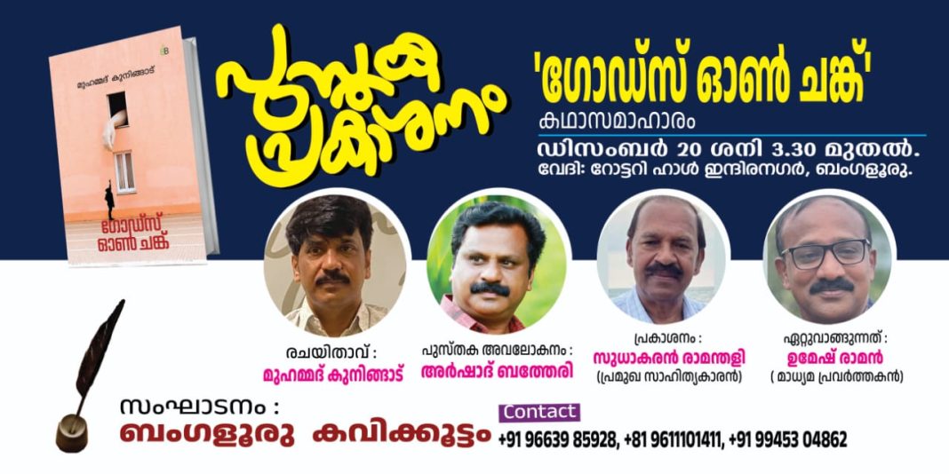 ബെംഗളൂരു: ബെംഗളൂരു കവിക്കൂട്ടത്തിന്റെ ആഭിമുഖ്യത്തിൽ ബെംഗളൂരുവിലെ എഴുത്തുകാരനും, സാംസ്‌കാരിക പ്രവർത്തകനുമായ മുഹമ്മദ്‌ കുനിങ്ങാടിന്റെ പുതിയ കഥാ സമാഹാരമായ ‘ഗോഡ്സ് ഓൺ ചങ്കി’ന്റെ പ്രകാശനം ഇന്ന് വൈകുന്നേരം 3.30 മുതൽ ഇന്ദിരാനഗർ റോട്ടറി ഹോളിൽ നടക്കും. വിവർത്തകനും കേന്ദ്രസാഹിത്യ അക്കാദമി പുരസ്കാര ജേതാവുമായ സുധാകരൻ രാമന്തളി പുസ്തകം പ്രകാശനം ചെയ്യും. മാധ്യമപ്രവർത്തകൻ ഉമേഷ്‌രാമൻ പുസ്തകം ഏറ്റുവാങ്ങും.