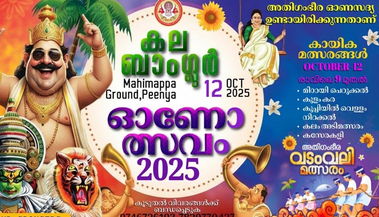 ബെംഗളൂരു: കല ബാംഗ്ലൂരിന്റെ ഓണാഘോഷം ‘ഓണോത്സവം 2025’ ഒക്ടോബർ 12 ന് രാവിലെ 9 മണി മുതൽ ചൊക്കസാന്ദ്ര മഹിമപ്പ സ്കൂൾ ഗ്രൗണ്ടിൽ നടക്കും.