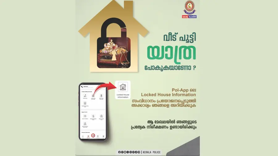 തിരുവനന്തപുരം: വീട് പൂട്ടി യാത്രപോകുന്ന കാര്യം പോലീസിനെ അറിയിക്കാൻ പോലീസിന്റെ ഔദ്യോഗിക മൊബൈൽ ആപ്പ് സജ്ജം. വീട് സ്ഥിതി ചെയ്യുന്ന ഭാഗങ്ങളിൽ പോലീസ് പ്രത്യേക നിരീക്ഷണം നടത്തും. പരമാവധി 14 ദിവസം വരെ വീടും പരിസരവും പോലീസിന്റെ നിരീക്ഷണത്തിലായിരിക്കും. പോൽ ആപ്പിലെ ‘Locked House Information” സൗകര്യം വിനിയോഗിച്ചാണ് പോലീസിനെ വിവരം അറിയിയിക്കേണ്ടത്.  യാത്രപോകുന്ന ദിവസം, വീട് സ്ഥിതി ചെയ്യുന്ന ലൊക്കേഷൻ, വീട്ടുപേര്, വീടിനു സമീപത്തുള്ള ബന്ധുക്കളുടെയോ അയൽവാസികളുടെയോ പേരും ഫോൺ നമ്പരും എന്നിവ ആപ്പിൽ നൽകേണ്ടതുണ്ട്. ഗൂഗിൾപ്ലേ സ്റ്റോറിലും ആപ്പ് സ്റ്റോറിലും പോൽ ആപ്പ് ലഭ്യമാണ്.