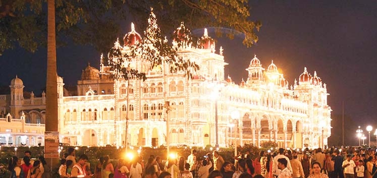 SUMMARY: Mysore Dussehra; The city and palace are decorated with lights.