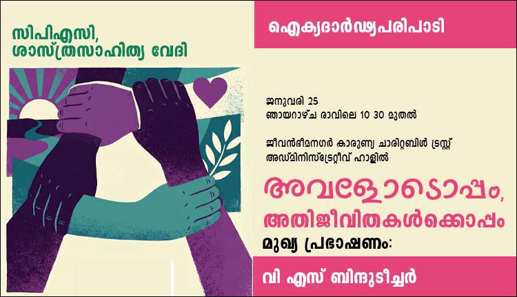 ബെംഗളൂരു: സിപിഎസിയുടെയും ശാസ്ത്രസാഹിത്യ വേദിയുടെയും സംയുക്താഭിമുഖ്യത്തില്‍ സംഘടിപ്പിക്കുന്ന ‘അവളോടൊപ്പം, അതിജീവിതകള്‍ക്കൊപ്പം’ ഐക്യദാര്‍ഢ്യ പരിപാടി ജനുവരി 25 ഞായറാഴ്ച രാവിലെ 10.30 മുതല്‍ ജീവന്‍ഭീമനഗറിലുള്ള കാരുണ്യ ചാരിറ്റബിള്‍ ട്രസ്റ്റ് അഡ്മിനിസ്‌ട്രേറ്റീവ്