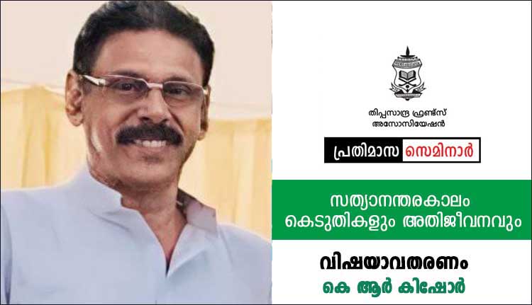 ബെംഗളൂരു: തിപ്പസാന്ദ്ര ഫ്രണ്ട്സ് അസോസിയേഷൻ പ്രതിമാസ സെമിനാർ ഡിസംബർ 28 ന് വൈകിട്ട് 4 മണിക്ക് തിപ്പസാന്ദ്ര ഹോളി ക്രോസ് സ്കൂളിൽ നടക്കും. സത്യാനന്തരകാലം കെടുതികളും അതിജീവനവും എന്ന വിഷയത്തിൽ എഴുത്തുകാരനും സാംസ്കാരിക പ്രവർത്തകനുമായ, കെ ആർ കിഷോർ സംസാരിക്കും. സാംസ്കാരിക പ്രവർത്തകനായ ടി.വി പ്രതീഷ് ചർച്ച ഉദ്ഘാടനം ചെയ്യും. പി. മോഹൻദാസ് അധ്യക്ഷത വഹിക്കും.