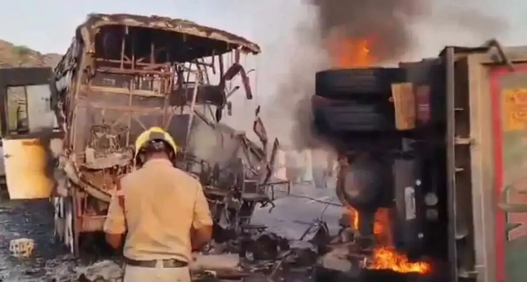 ബസ് മാര്ക്കാപുരത്തിനു സമീപം വച്ച് മണ്ണ് കയറ്റിവന്ന ലോറിയുമായി കൂട്ടിയിടിച്ച ശേഷം തീപിടിക്കുകയായിരുന്നു. പരുക്കേറ്റവരില് പലരുടെയും നില ഗുരുതരമാണ്. സ്ലീപ്പര് ബസാണ് അപകടത്തില്പ്പെട്ടത്. 34 പേരാണ് ബസില് ഉണ്ടായിരുന്നത്. ഹരികൃഷ്ണ ട്രാവല്സിന്റെ ബസാണ് അപകടത്തില്പ്പെട്ടത്.